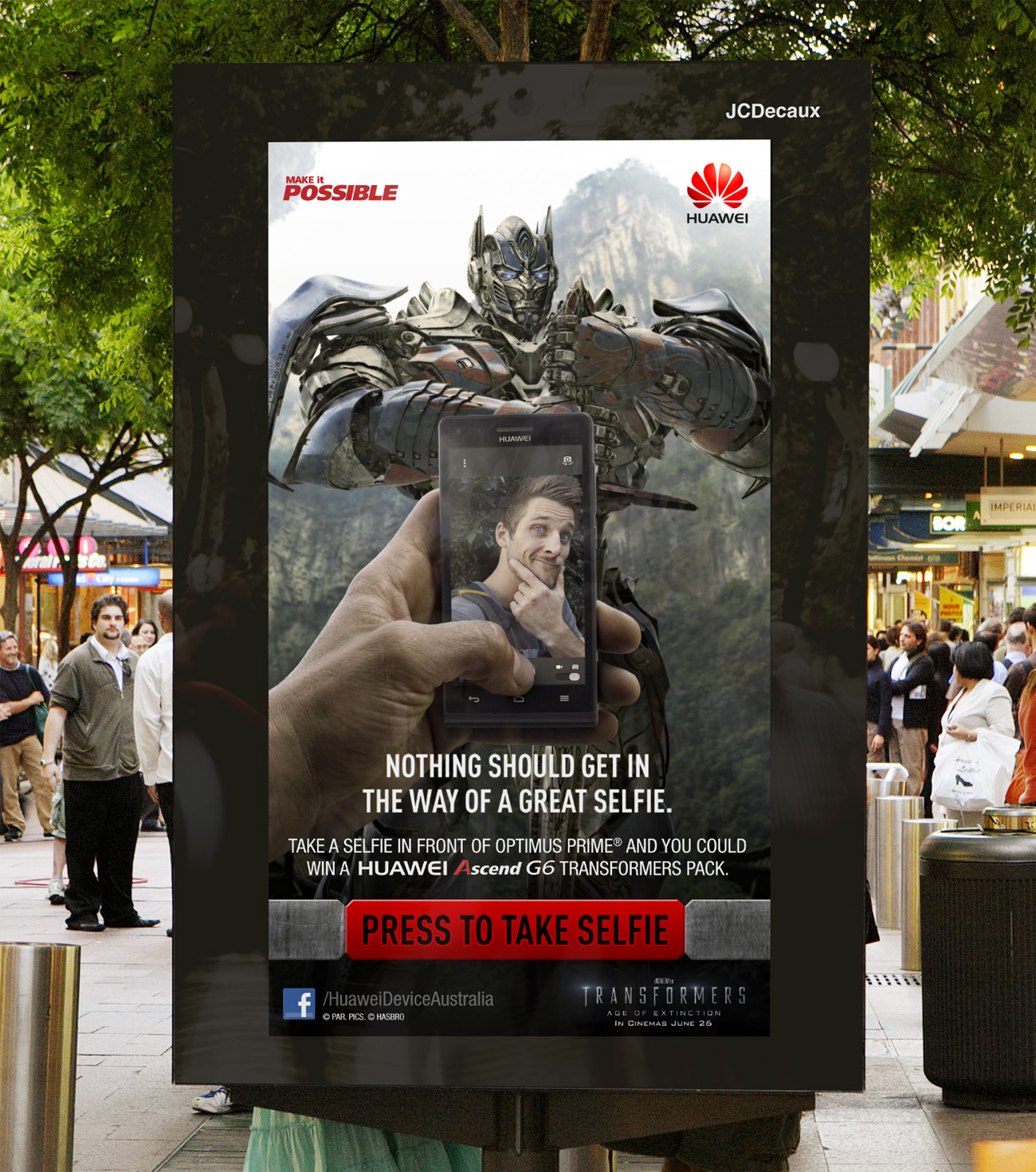 This interactive outdoor kiosk was part of a cross promotion between Huawei Australia and the movie Transformers: Age of Extinction. Through the use of the touch-screen and an in-built camera, people were able to take a selfie of themselves. This would then be superimpose into an image being taken in front Optimus Prime, jokingly ignoring the impressive robot in a tongue-in-cheek manner. The user would then be able to enter their details to receive a copy and be entered into the draw to win a Huawei Ascend G6 Transformers Pack.