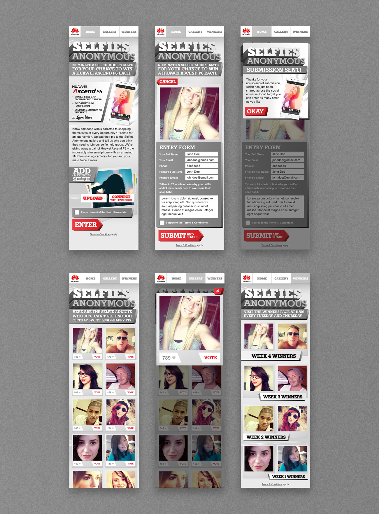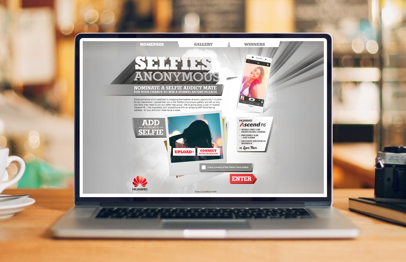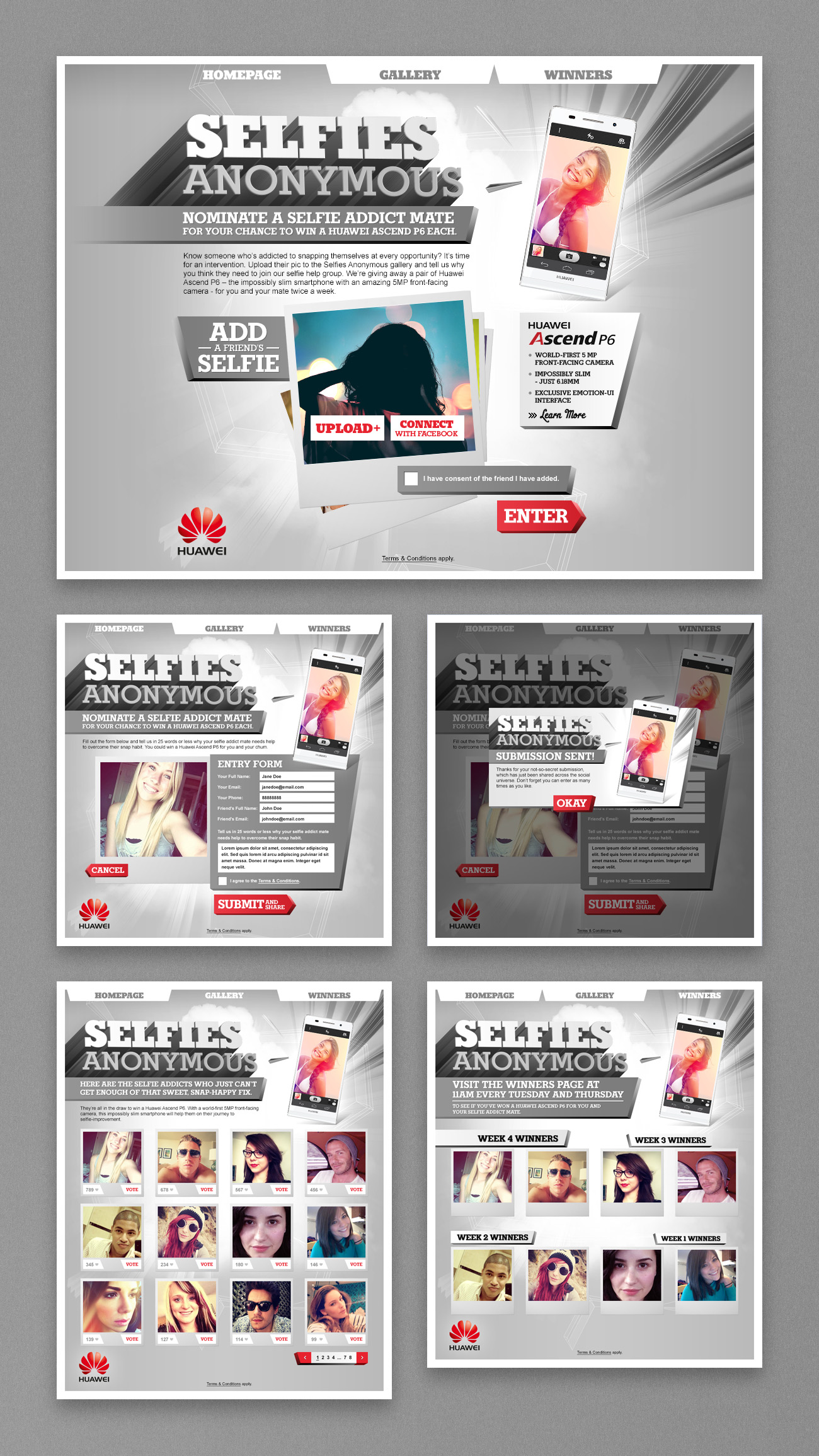 A Huawei Australia campaign website promoting the “Selfies Anonymous” campaign. Participants would upload selfies each week, view a gallery of the entrants, vote on which selfie they think was the best, and view each week’s winners. The visuals leveraged a similar style to the extruded text used to promote Huawei within Australia, while the palette was kept muted to act as a backdrop, hero-ing the vibrant selfies.