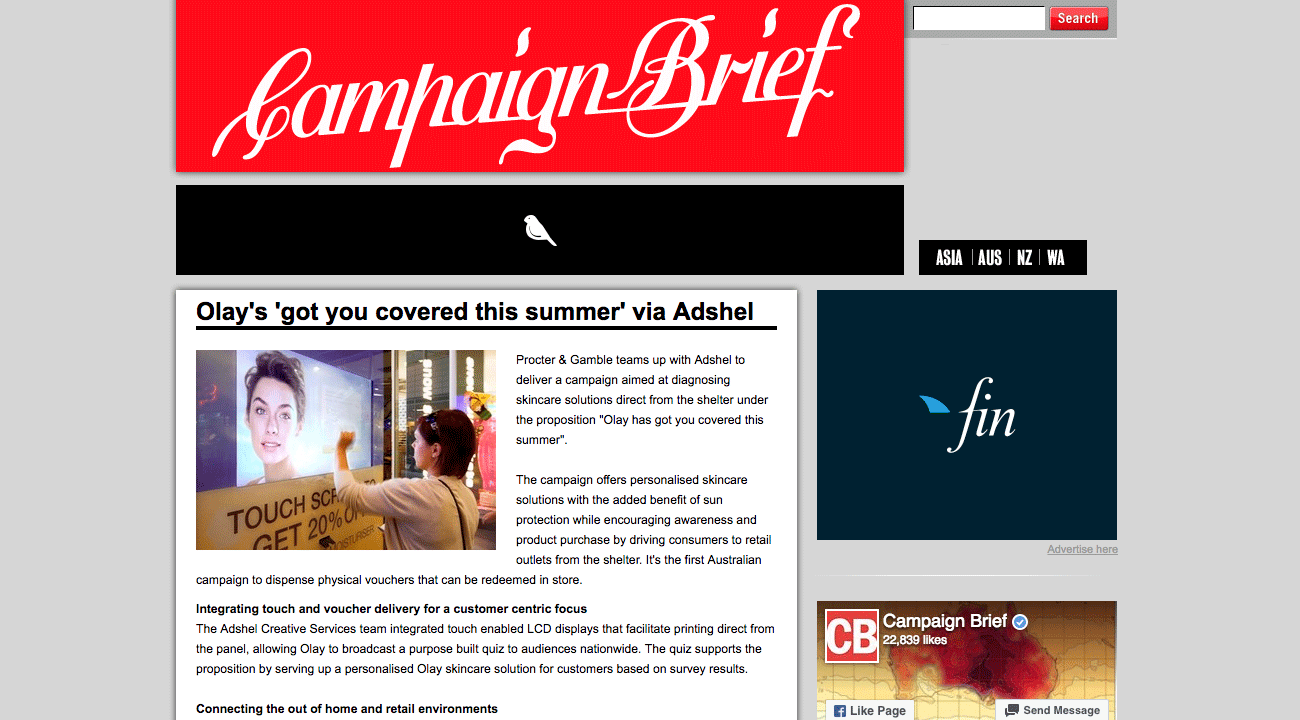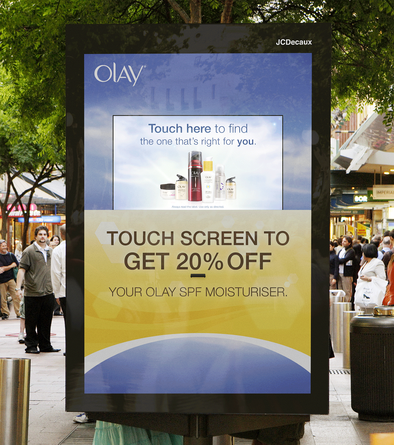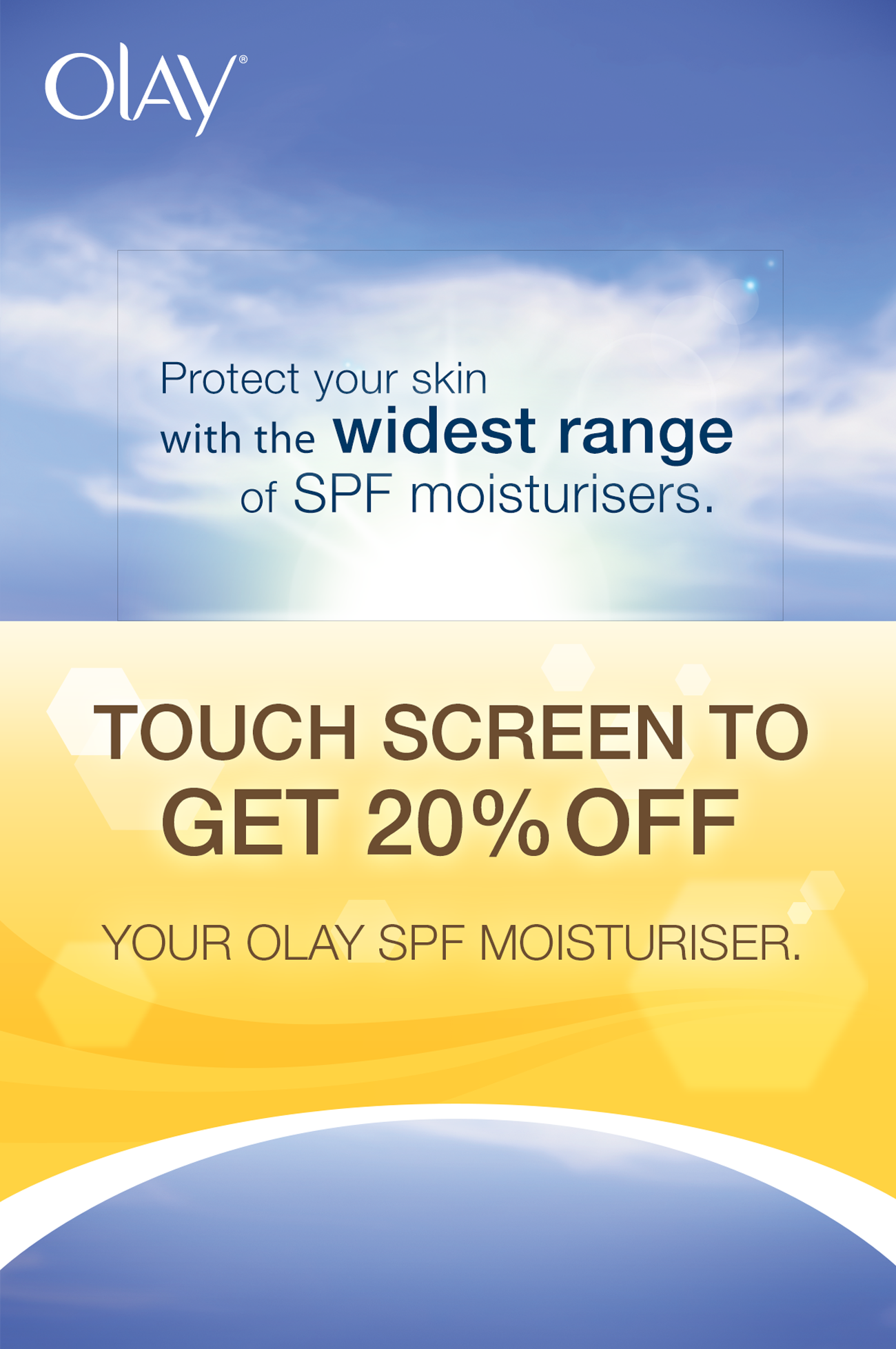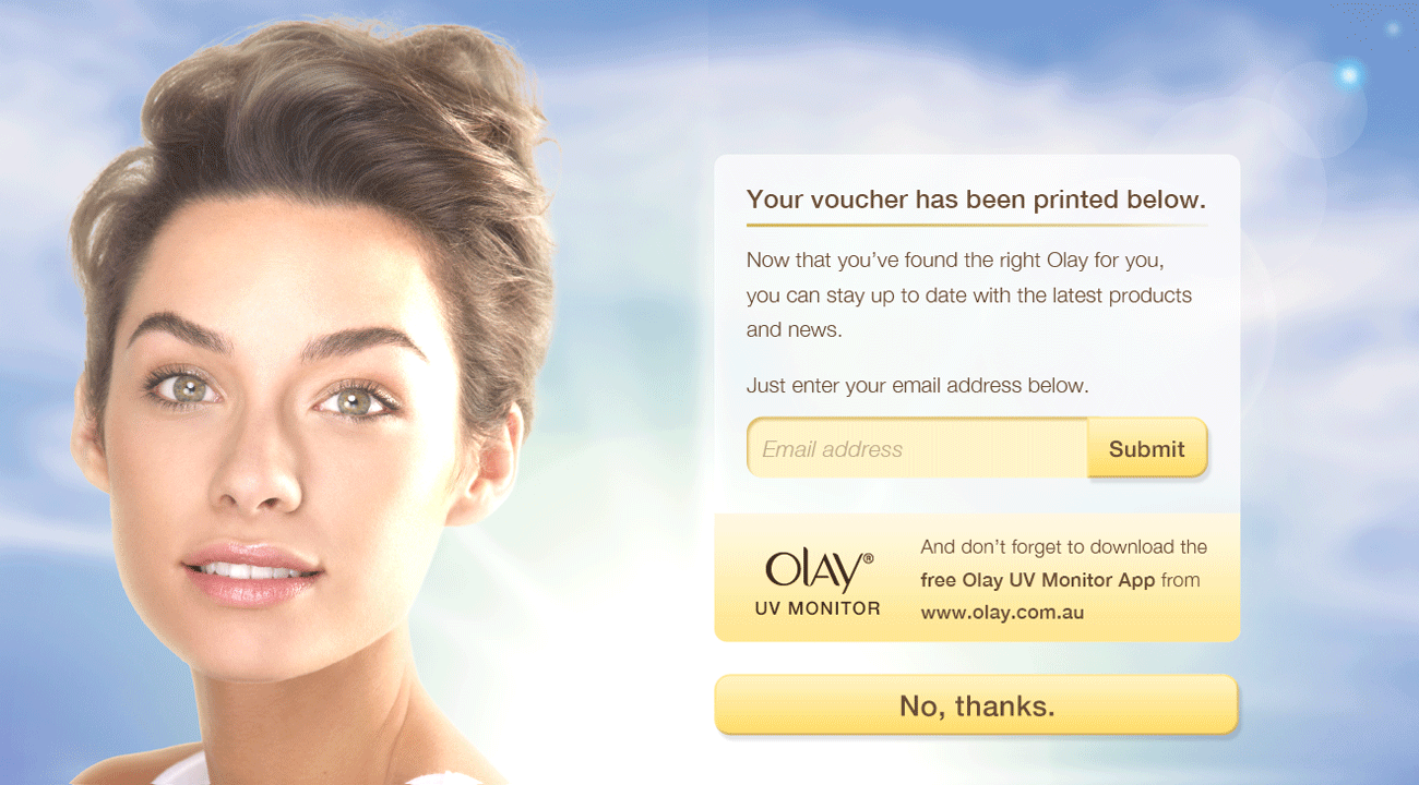 As part of Olay’s “Right Olay For You” campaign, this interactive touch-screen kiosk provides the user with a short multiple choice questionnaire about their skin. Once completed, a personalised Olay product suggestion is given, as well as the option to print a Priceline discount voucher for the product. Additionally the option to sign-up for Olay’s newsletter is available, alongside an advert for the Olay UV Monitor app. This was an interesting project, with UI, print, and motion graphics all working together.